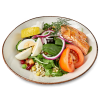 dressing: vinegrette ( olja, balsamico vinäger (vinäger av vin, koncentrerad druvmust), salladskrydda (salt, lök, vitlök, örter (persilja, oregano, basilika, timjan, dragon, salvia), druvsocker, purjolök, klumpförebyggande medel (kiseldioxid)), citron.