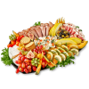Lyxigt fat bestående av varmrökt lax, rostbiff, lufttorkad skinka, ägghalvor med räkor och majonäs, brieost med två olika kex och marinerade oliver dekorerat med frukt (druvor, physalis, kiwi, melon) och grönt (cocktail tomater, sallad, dill).