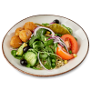 Ingredienser: bulgur 66%(durumVETE, persilja), ruccola, babyspenat, röd mangold, basilika, gurka, tomat, peperoni (peperoni, vatten, havssalt, surhetsreglerande medel: ättiksyra, citronsyra, konserveringsmedel: E211 och E223), oliver (oliver, vatten, paprikapasta (paprika, förtjockn.medel (natriumalginat, guargummi), stabiliser.medel (E509), konserv.medel (E202), salt, syra (mjölksyra)), rödlök, majs, ärtor, morotsbollar (morot, potatis, kålrot, röda linser, gula ärtor, potatisflingor, potatismjöl, grönsaksbuljong (salt, lök, socker, maltodextrin (majs), arom), gult lökpulver, guarkärnmjöl, salt, vitpeppar, rapsolja), dressing: vinegrette ( olja, balsamico vinäger (vinäger av vin, koncentrerad druvmust), salladskrydda (salt, lök, vitlök, örter (persilja, oregano, basilika, timjan, dragon, salvia), druvsocker, purjolök, klumpförebyggande medel (kiseldioxid)).