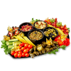 Matigt fat bestående av falafel, ris fyllda vinbladsdolmar, mozzarella & soltorkad tomat, olivtapenade, bönsallad, oliv & cornichons med vitlöksolja, kronhjärtan sallad med soltorkad tomat och vitlöksolja. Vackert upplagt tillsammans med passande frukter och grönsaker.