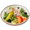 Sallad gjörd på pasta med pesto samt grillad kycklingfilé, räkor, mjukost och grönsaker.